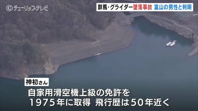 9日、群馬県長野原町の湖にグライダーが墜落した事故で、死亡したのは富山市に住む68歳の男性だったことがわかりました。男性は自家用滑空機上級の免許を1975年に取得し、飛行歴は50年近くでした。
