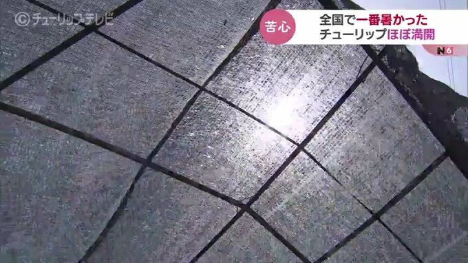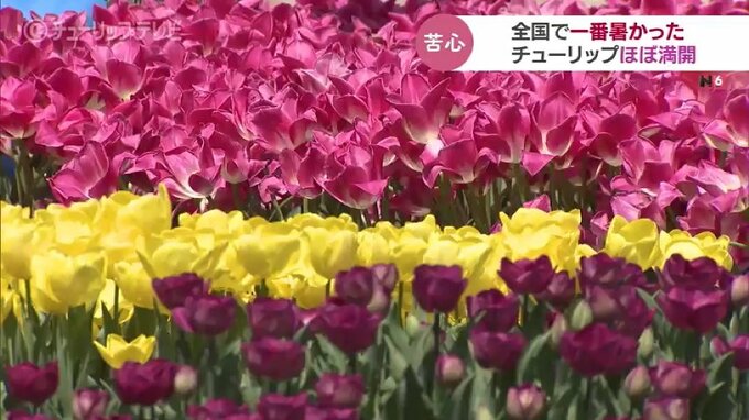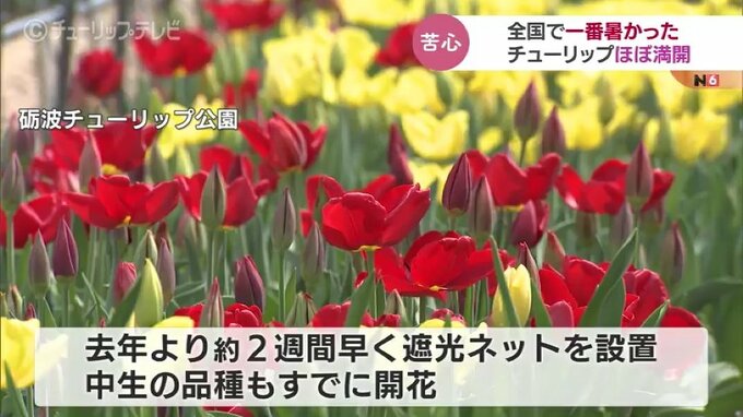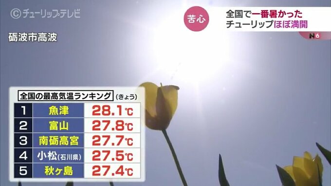 11日の富山県内は、最高気温が28℃を超えたところもあり、夏のような暑さとなりました。季節はずれの暑さで、今月22日に開幕するチューリップフェアの会場では花がほぼ満開となり、関係者は頭を悩ませています。