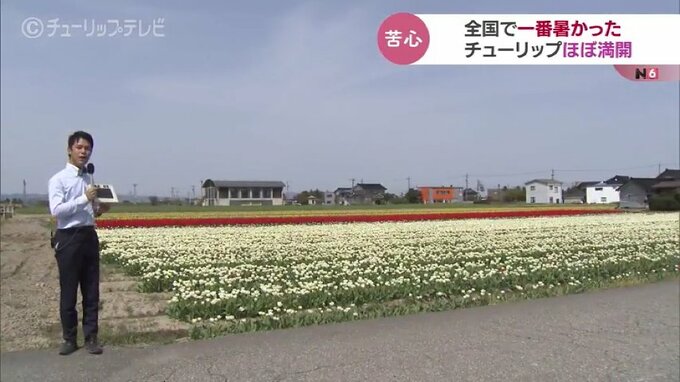 「午後1時の砺波市です。手元の温度計は26℃を示していて、長袖シャツ一枚でも汗ばむほどです。この連日の暑さの影響で、例年より一足早くチューリップが見ごろを迎えています」