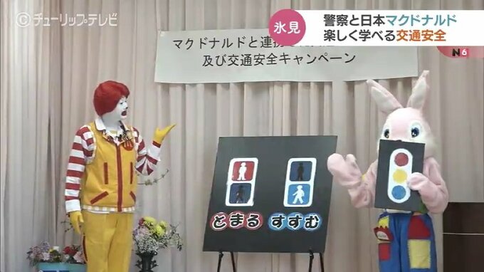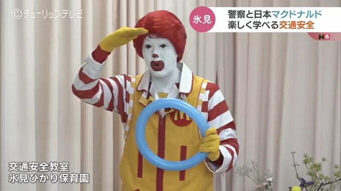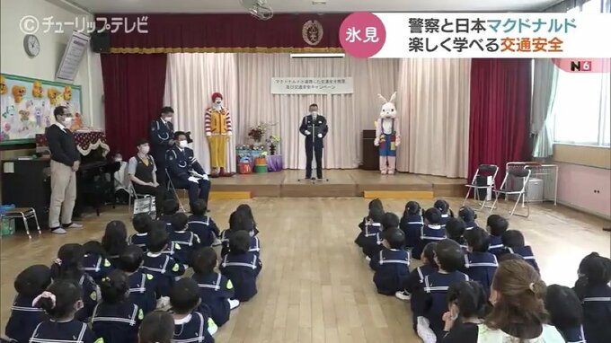 これは交通安全への意識を高めてもらおうと、富山県警氷見警察署と日本マクドナルドが連携して開催したもので、この日は地元の園児、合わせて48人が参加しました。