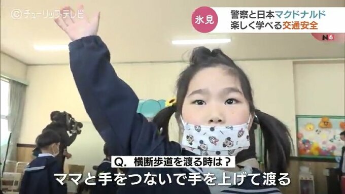 園児は日本マクドナルドのマスコットキャラクター、ドナルドから、信号のある交差点の注意点や横断歩道の渡り方の説明を受け、楽しく交通安全を学んでいました。