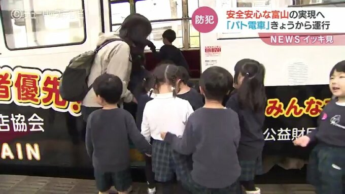 この日は南富山駅前で出発式が行われ、近くの堀川幼稚園の園児たちを乗せ、「パト電車」が富山駅に向けて出発しました。