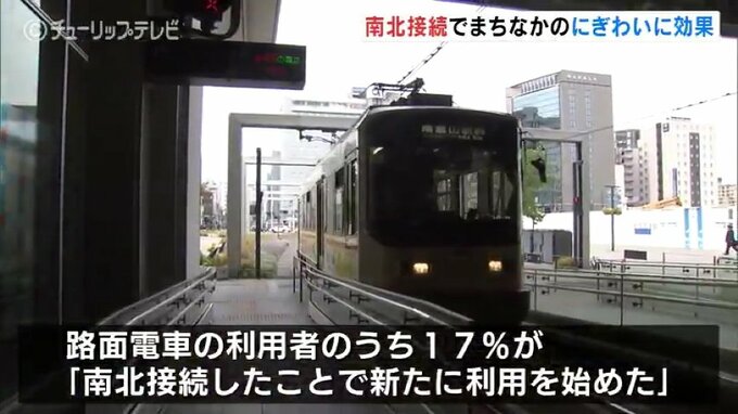 また、路面電車の利用者のうち17パーセントが、「南北接続したことで新たに車などから転換して利用を始めた」と答えたほか、沿線住民の2割近くが、南北接続後に「中心市街地を訪れる機会が増えた」と答えています。