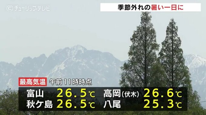 このあとも気温は上昇し、日中の予想最高気温は富山で今シーズン最高の28℃、高岡市の伏木で27℃と、平年よりも10℃ほど高く7月上旬並みの季節外れの暑い一日となる見込みです。