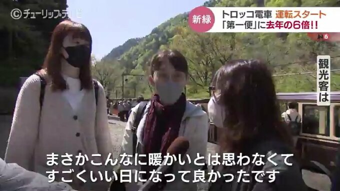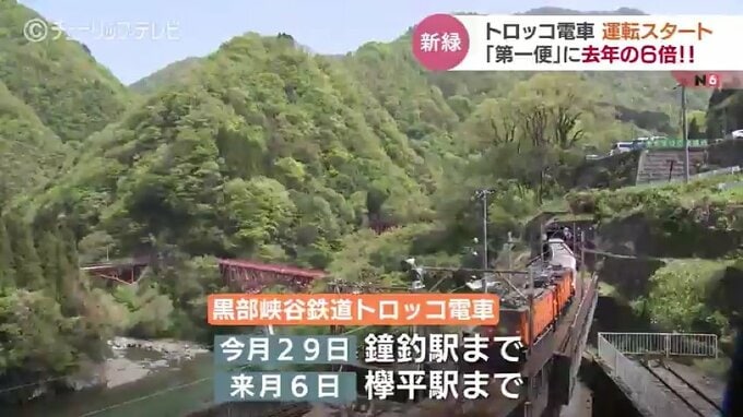 絶好の行楽日和にスタートを切ったトロッコ電車。4月29日に鐘釣駅まで開通、5月6日には欅平駅(けやきだいらえき)までの全線で運行が始まります。