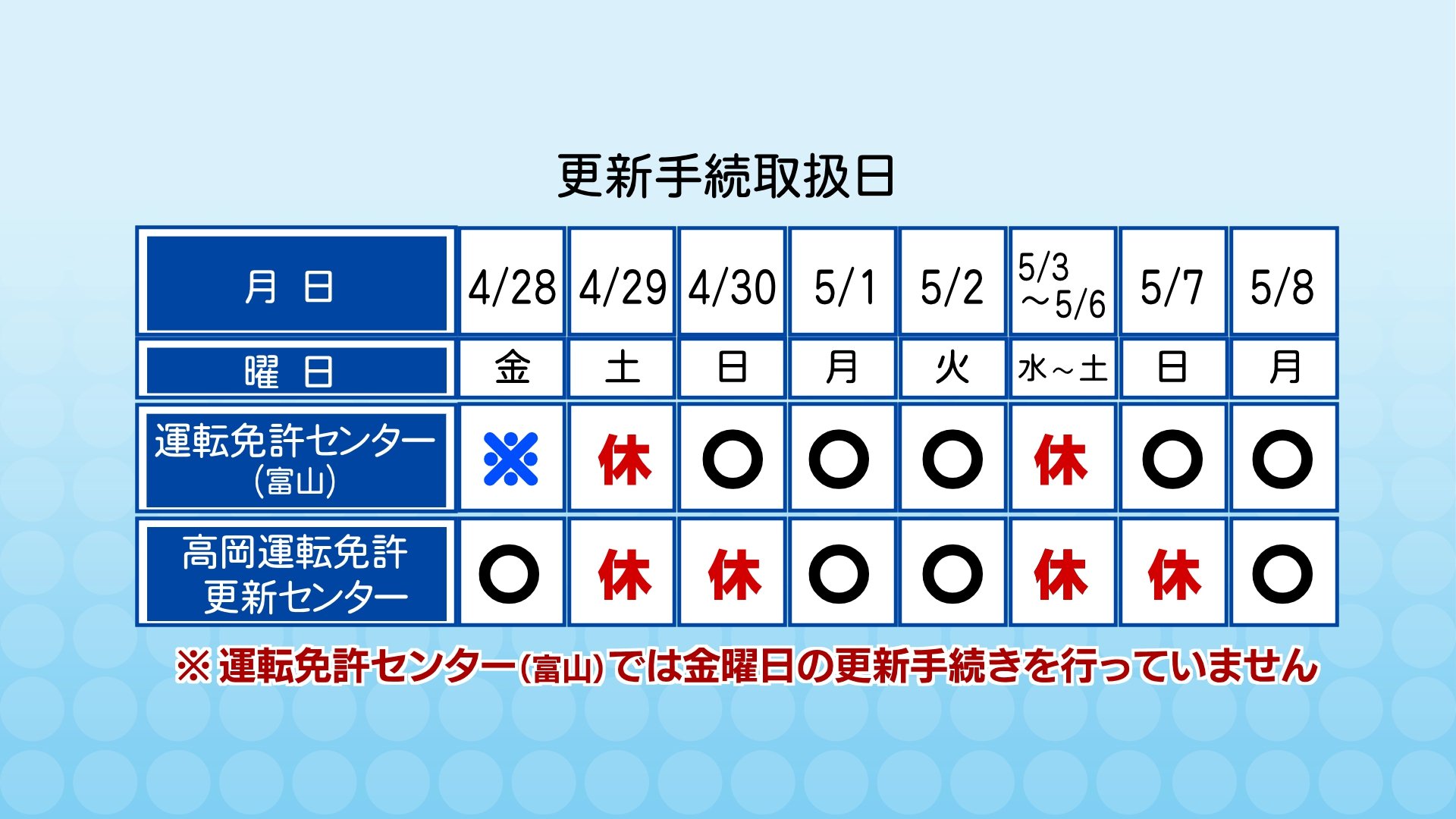 きょう(28日)は、高岡運転免許センターのみ業務を行い、富山の運転免許センター業務は、ゴールデンウイーク期間中は、30日(日)から5月2日(火)までの3日間です。高岡運転免許センターは1日(月)2日(火)となります。