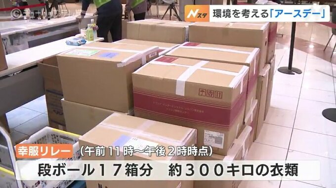 3年目のことしは、使わなくなった衣料品を回収してリサイクルする「幸服(こうふく)リレー」を実施。午前11時からの3時間で30人以上が訪れ、段ボール17箱分、およそ300キロの衣類が集まったということです。