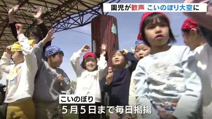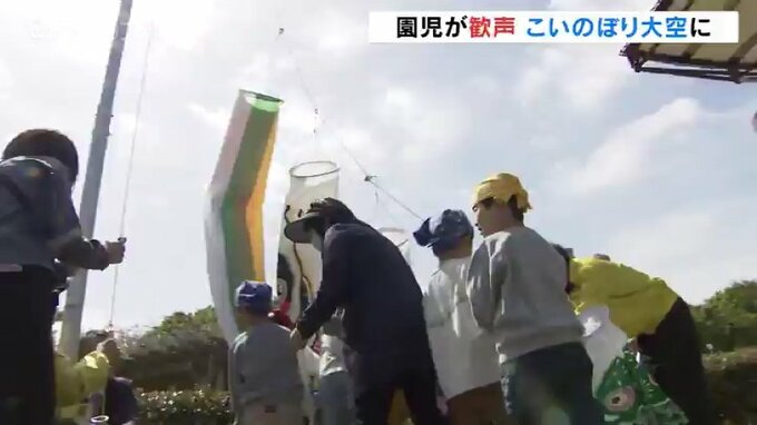 「いち、に」の掛け声で力を合わせ、ロープを引っ張ると4匹の巨大なこいのぼりが大空に舞い上がり、園児から歓声が上がりました。