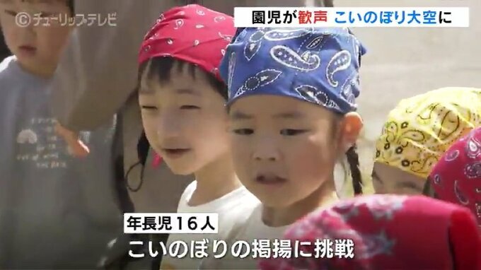 この日は、年長の園児16人が、こいのぼりの掲揚に挑戦しました。
