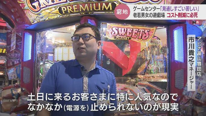 市川貴之マネージャー:「こちらとか、大型のメダルゲーム機は200ボルトの電源を使っていますので、非常に消費電力は大きいです。土日にいらっしゃるお客さまには特に人気なので、なかなか(電源を)止められないのが現実です」