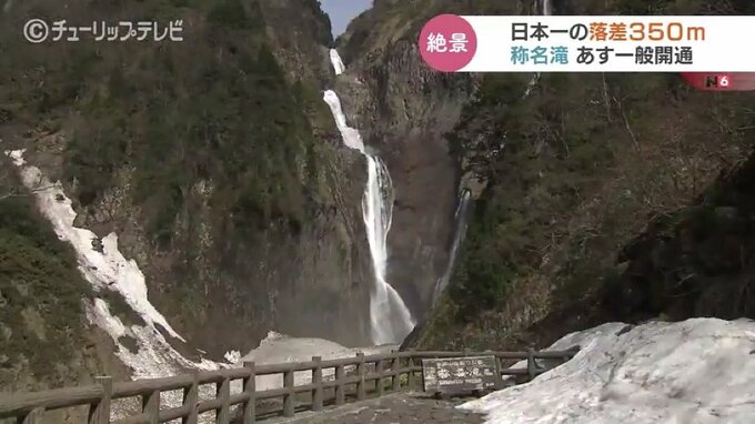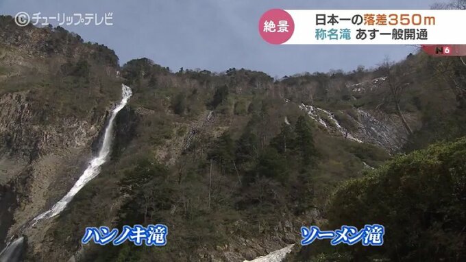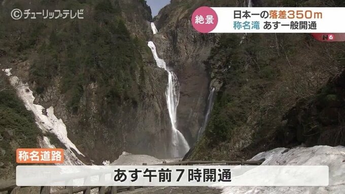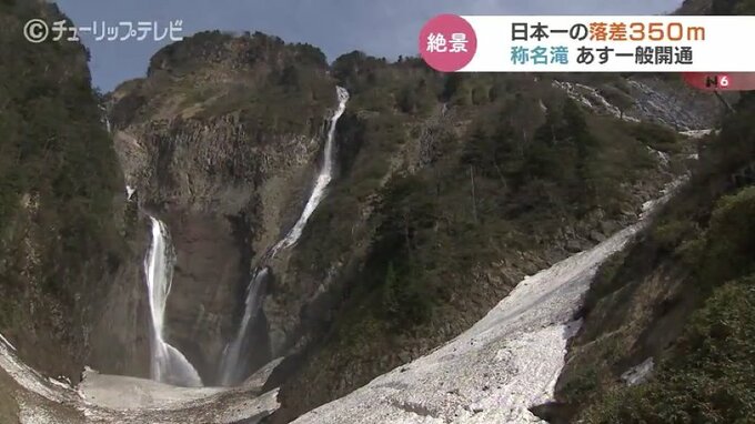 日本一の落差350メートルを誇る富山の観光スポット“称名滝”への県道が開通するのを前に28日、一足先に報道陣や関係者に公開されました。