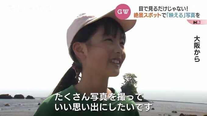 大阪から来たの女の子:「海がとてもきれいです。(Q.おいしいものは食べましたか?)海鮮丼を食べました。たくさん写真を撮っていい思い出にしたいです」