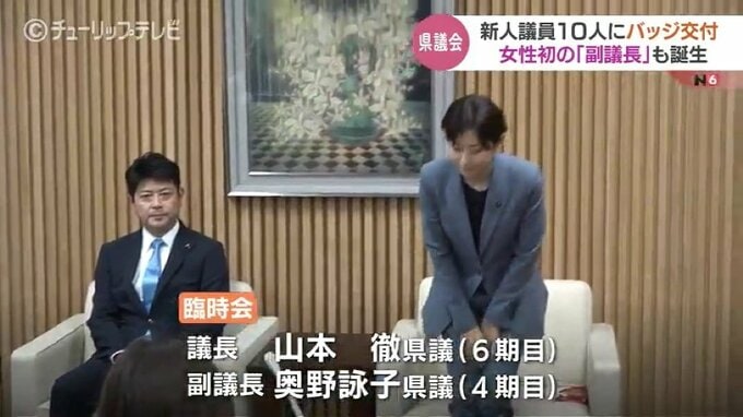 その後の臨時会では新しい議長に6期目の山本徹県議、副議長に4期目の奥野詠子県議を選出しました。