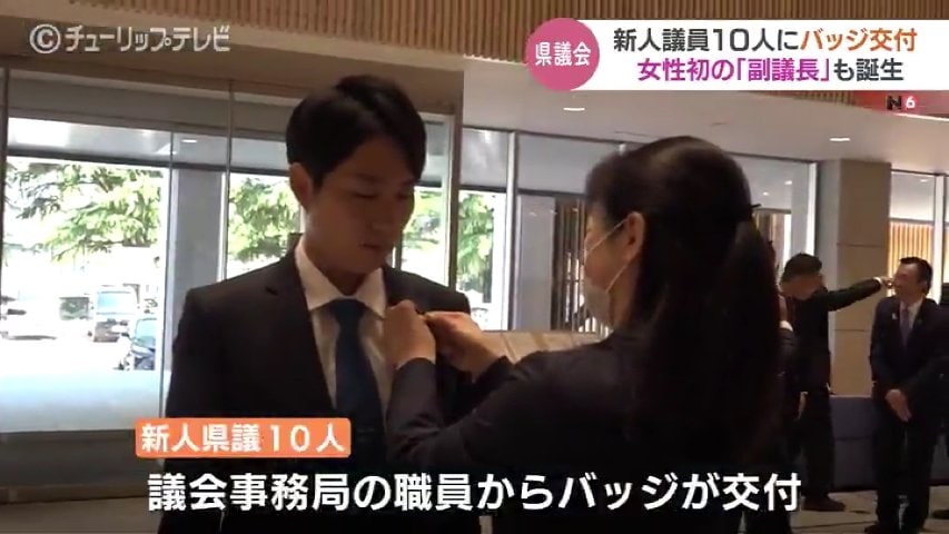 2日は4月の県議選で当選した40人に議員バッジが貸与されました。このうち新人10人が議事堂の玄関ホールで議会事務局の職員から1人ずつ胸にバッジを付けてもらいました。