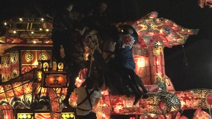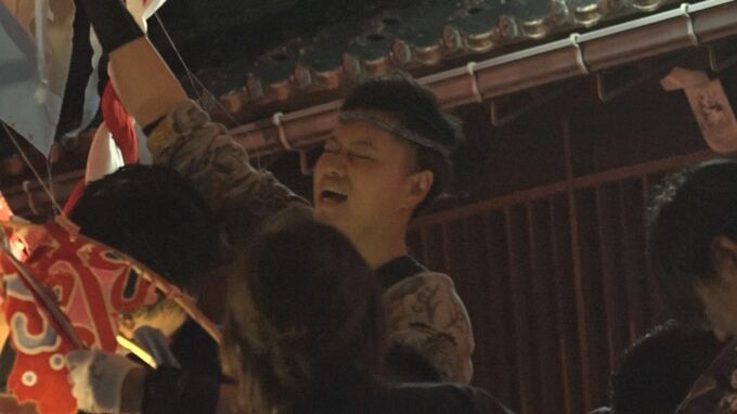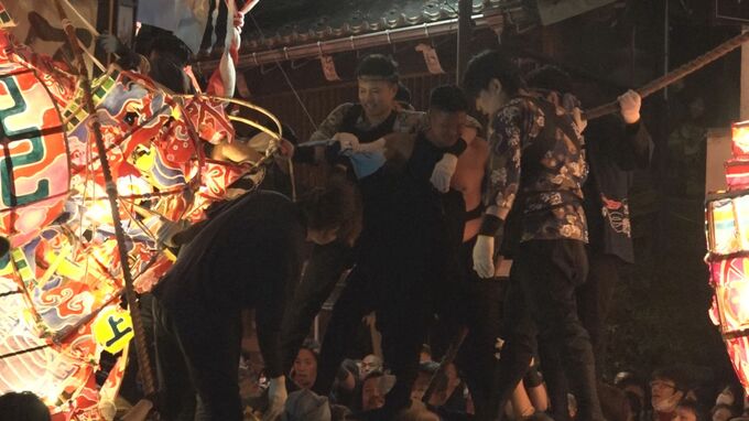 竹内ジーナ記者:「蹴って蹴って蹴りまくる若連中、すごく激しいです」「ほかの行燈に乗り移る若連中もいます」