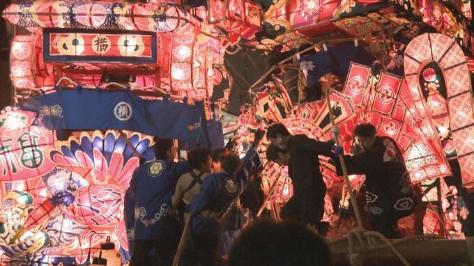 祭りの最大の見せ場は各町の若連中が激しく行燈を壊しあう「引き合い」。