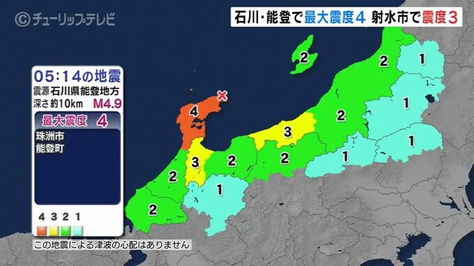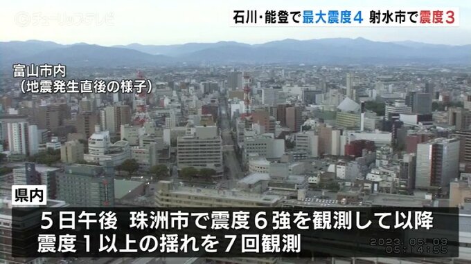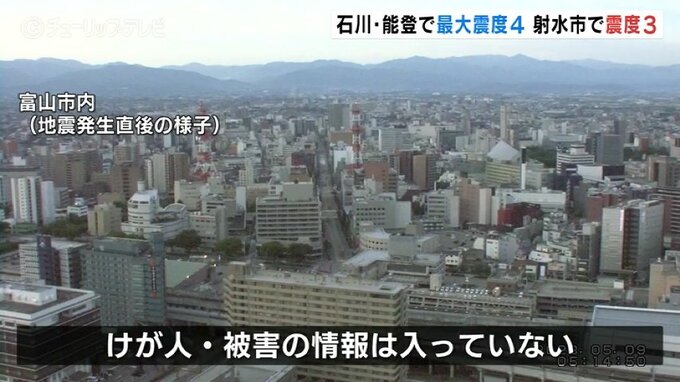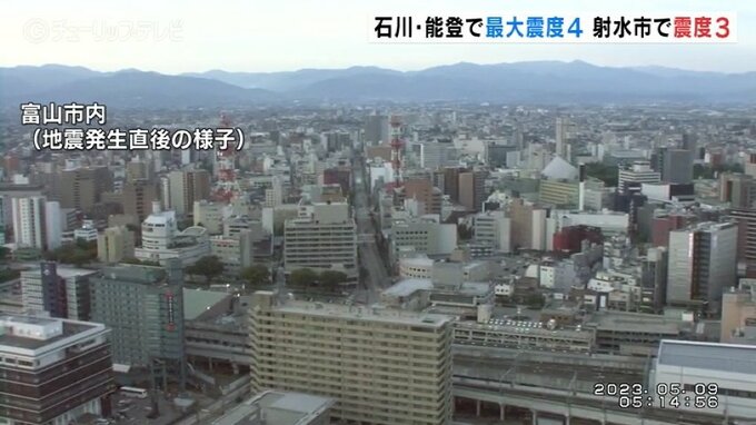 9日午前5時すぎ、石川県能登地方を震源とする地震があり富山県内では射水市で震度3を観測しました。