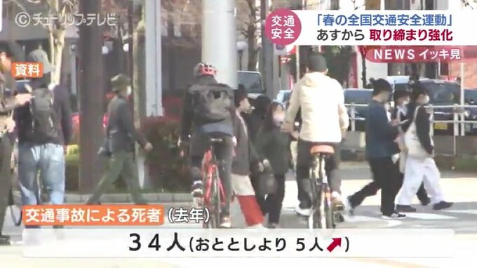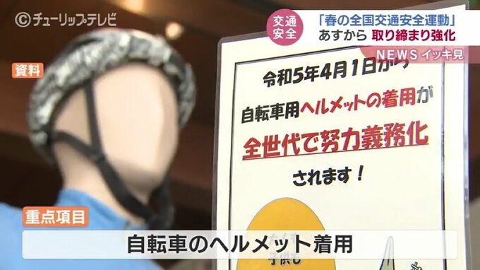 「春の全国交通安全運動」の期間は5月11日から10日間で、子どもを始めとする歩行者の安全確保や、道路横断中の事故防止、4月から努力義務化された自転車のヘルメット着用の3つが重点項目となっています。