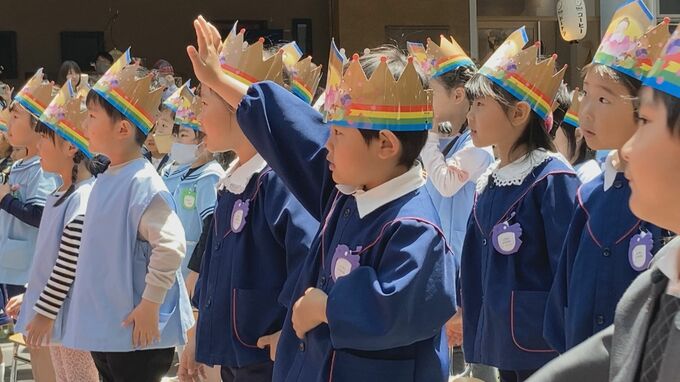 このあと、園児の代表が壇上に上がり、色とりどりの花びらをかたどった紙などをまく散華の儀式が行われ、お釈迦さまの誕生を祝いました。