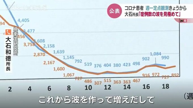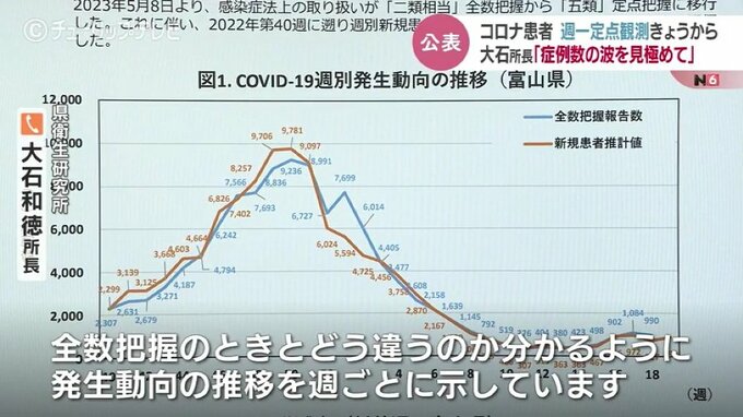 富山県衛生研究所 大石和徳所長:「定点観測は始めたばかりなので、全数把握のときとどう違うのか分かるように、発生動向の推移を週ごとに示しています。これから波を作って増え出して、上り坂になってくるとそれは要注意ことになるでしょう」