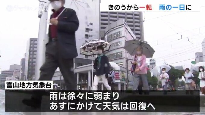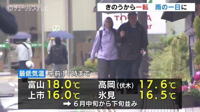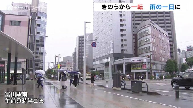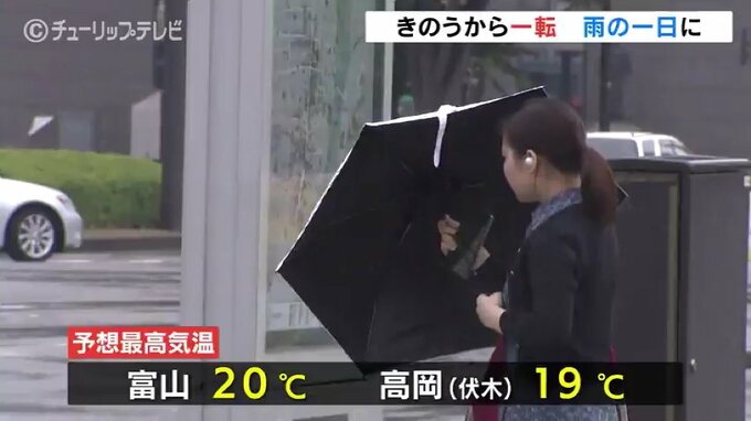 19日の富山県内は前日までの夏を思わせる陽気から一転雨が降っていて、最高気温は10℃以上下がる見込みです。