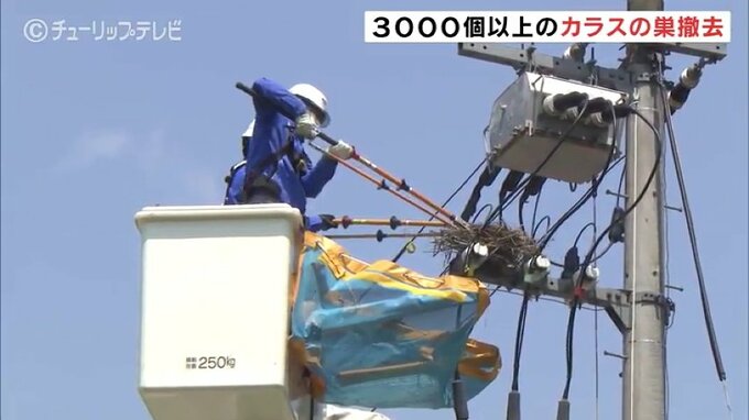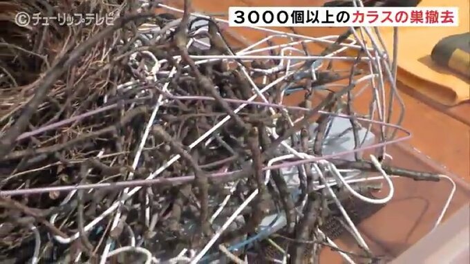 カラスが電柱に巣を作ることで発生する停電を防ぐため、北陸電力送配電がことし2月から富山県内で3200個の巣を撤去しました。