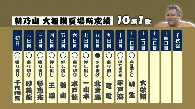 朝乃山:「相撲内容は悪いですけど、左上手がとれてましたので、まあ、でも自分の相撲じゃないですけど。最後は思い切った結果です。あしたから、また切り替えて自分の相撲をとりたいです。この2日間悪いので、はい」