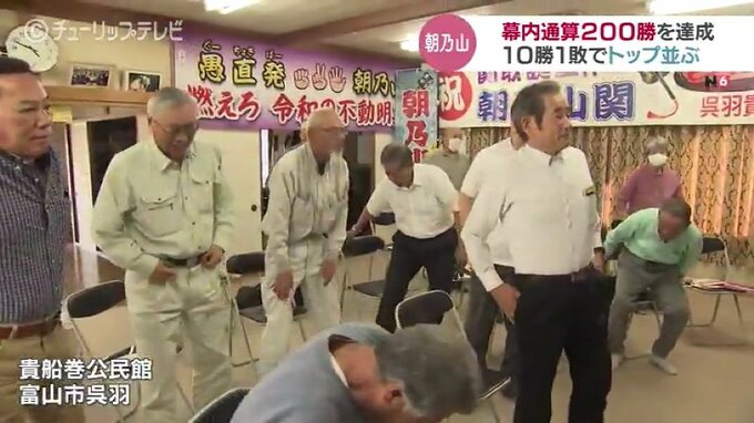 優勝争いの先頭を走る朝乃山。対するは、ここまで2敗と好調の東前頭六枚目、明生。おひざ元の富山市呉羽地区でも、貴船巻公民館に集まった人たちが固唾をのんで見守ります。
