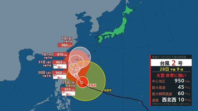 また、気象庁によりますと大型で非常に強い台風2号は、28日午後9時現在フィリピンの東にあって西北西に1時間におよそ10キロの速さで進んでいます。