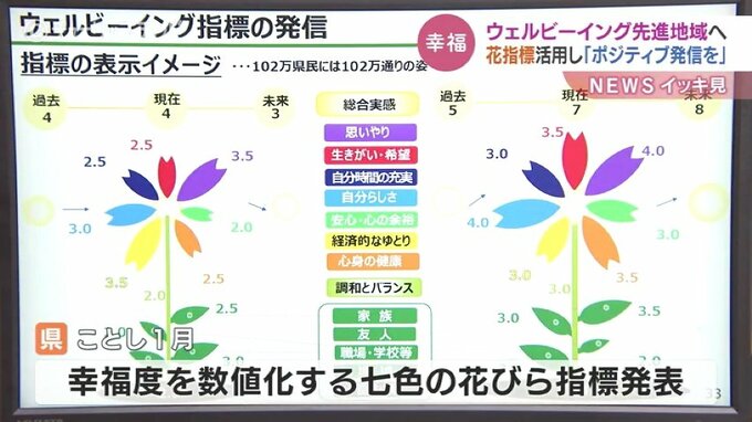 富山県は、今年1月、幸福度を数値化する七色の花びらを表す指標を発表。今年度からは、このウェルビーイング指標を施策や効果検証に積極的に活用していく方針です。