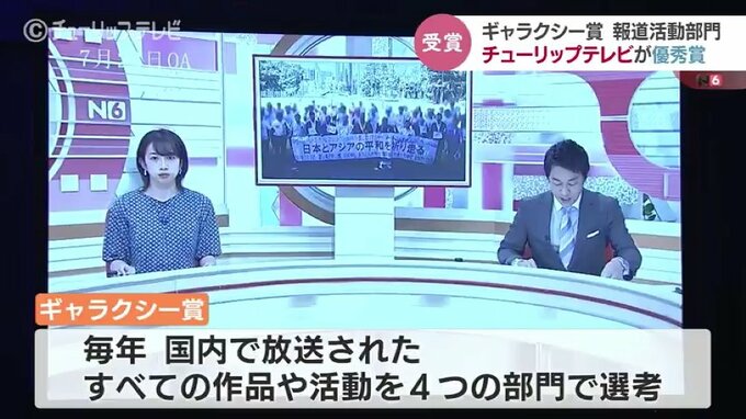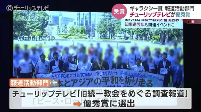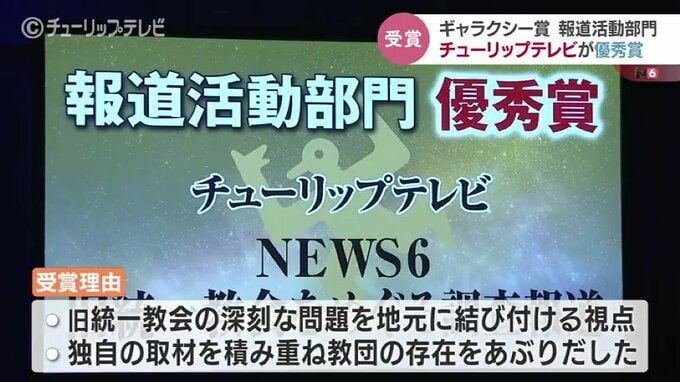 ギャラクシー賞は国内で放送された作品や活動を4部門で選考していて、ことしの「報道活動部門」では、チューリップテレビの「旧統一教会をめぐる調査報道」が大賞に次ぐ優秀賞に選ばれました。