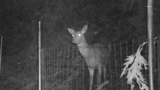 また、山のふもとにある集落近くに設置された監視カメラには、4頭のニホンジカが映っていました。1頭は、柵の前に立っていますが、この直後…。