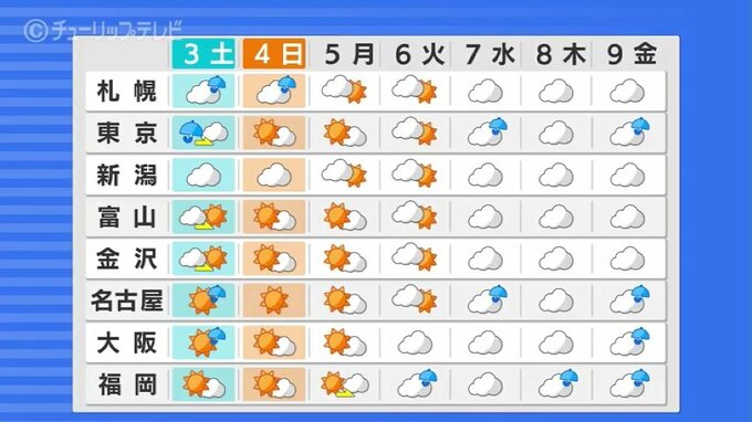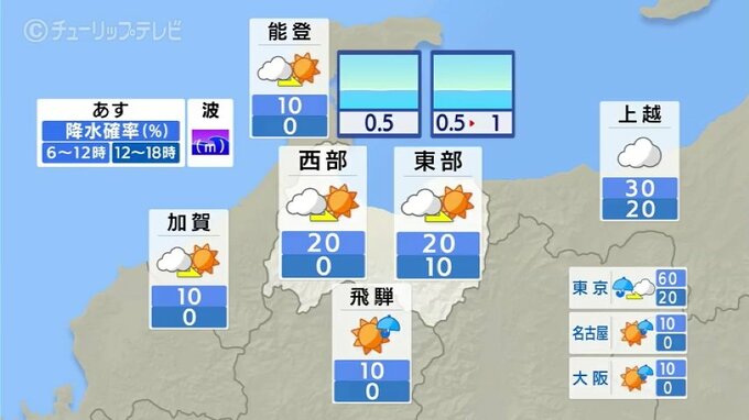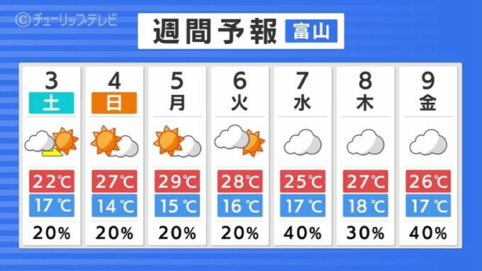 富山県西部は、午前中は曇りですが午後には晴れ間が広がります。気温はきょうと同じくらい。長袖シャツ一枚でちょうどいいくらいでしょう。