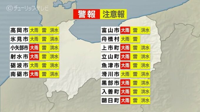 富山市や射水市などに土砂災害に関する大雨警報です。このほか大雨注意報と洪水注意報が発表されています。このあと雨はやんできますが、警報、注意報が解除されるまでは、がけや斜面、川や用水には近づかないでください。