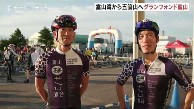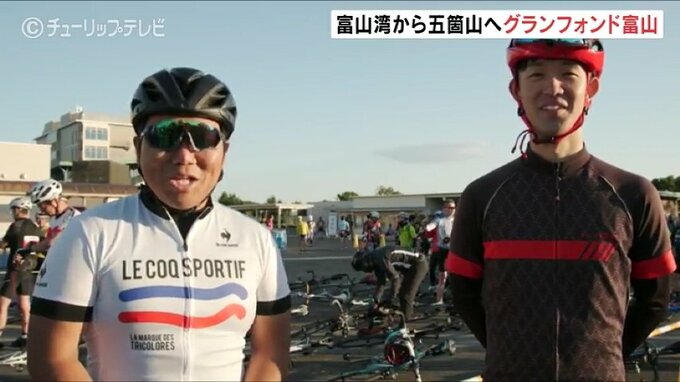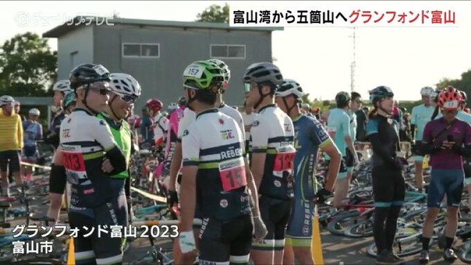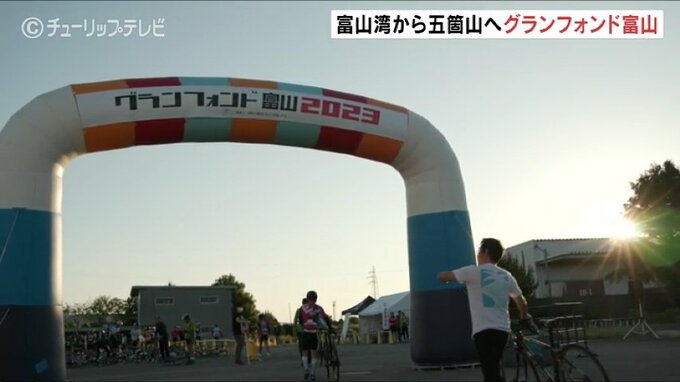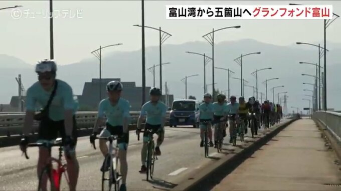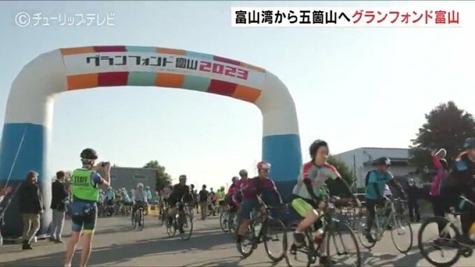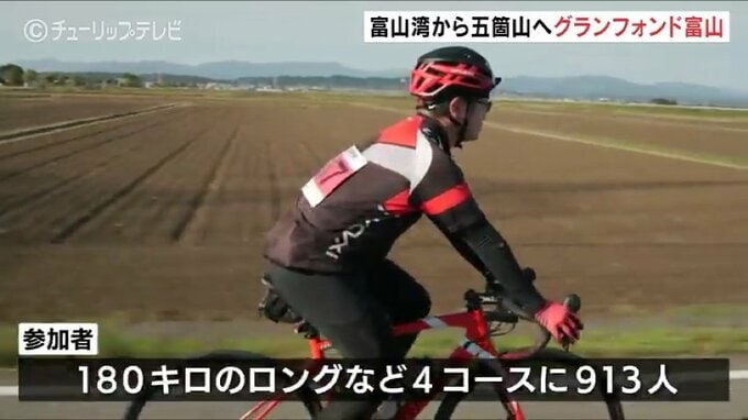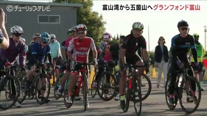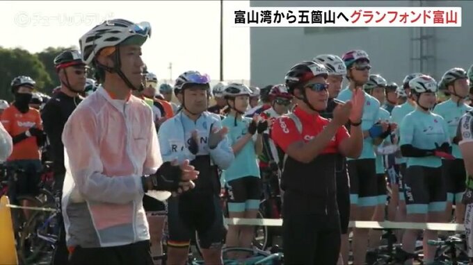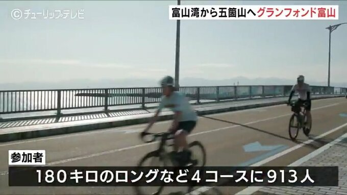 グランフォンド富山は、富山市のドリームスタジアムとやまを発着点に、海抜0メートルの富山湾から世界遺産の五箇山を走るもので、180キロのロングコースなどに県内外のサイクリスト913人が参加しました。