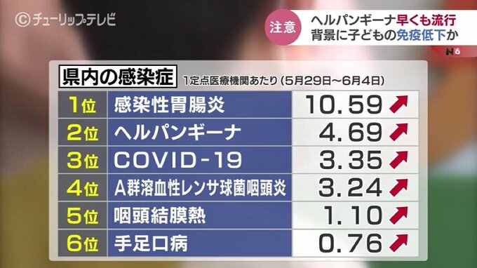 増えているのはヘルパンギーナだけではありません。富山県内の感染症患者は、1定点あたり、ウイルス性胃腸炎が10・59人ともっとも多く続いてヘルパンギーナ、新型コロナとなっていて、このほかにも咽頭炎や手足口病などさまざまな感染症が増加傾向にあるのです。