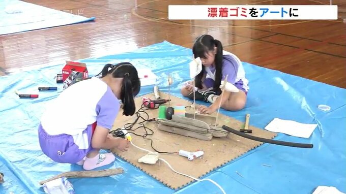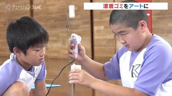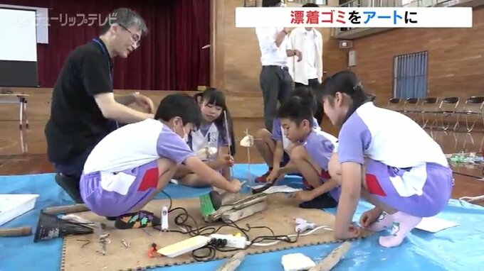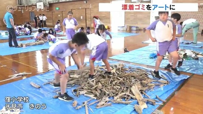 7日は4年生が、氷見市の松田江浜で自分たちで拾い集めた流木やペットボトルなどのゴミを材料に、思い思いの作品づくりに挑戦しました。