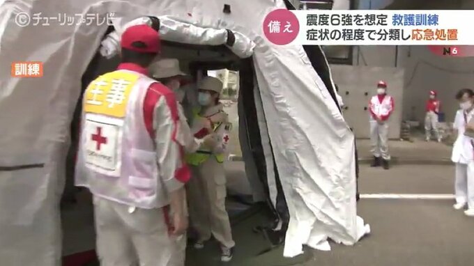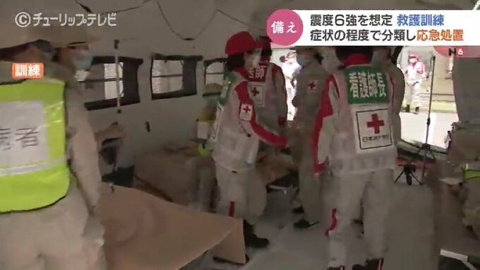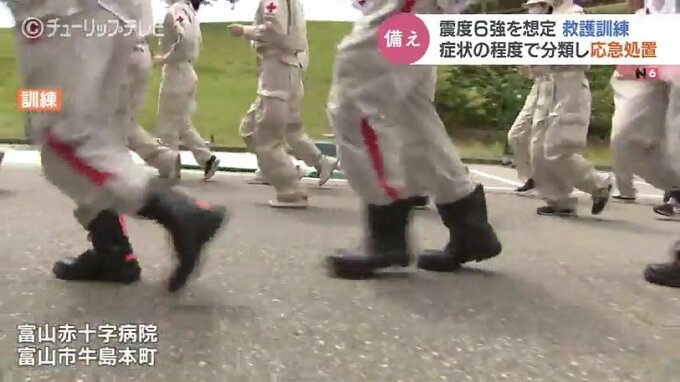 この訓練は日本赤十字富山県支部が毎年行っているもので、9日は呉羽山活断層帯を震源としたマグニチュード7・2、震度6強を観測する地震が起きたことを想定して行われました。