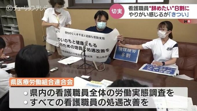 調査結果を受けて、富山県医療労働組合連合会では、県に、県内の看護職員全体を対象とした労働実態調査や処遇の改善を求めています。