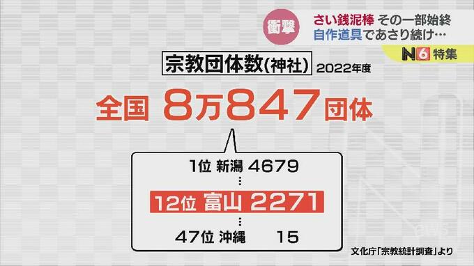 文化庁の調査では全国にある神社の数は8万847団体。なかでも富山県は2271団体と全国12番目の多さです。(参考:1位新潟県4679団体、47位沖縄県15団体)