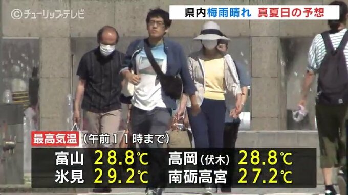 午前11時までの最高気温は富山と高岡市の伏木でともに28,8℃、氷見で29,2℃などとなっています。