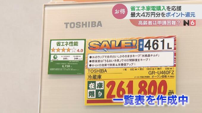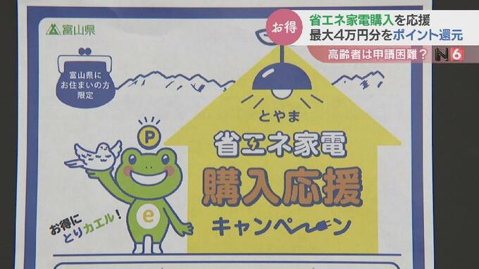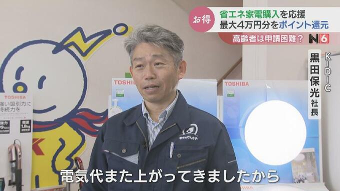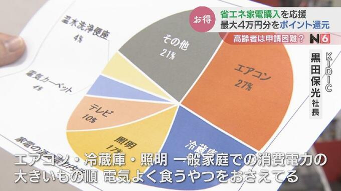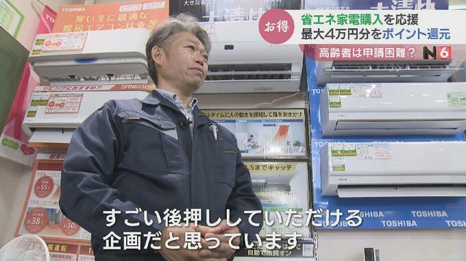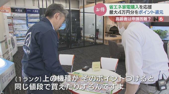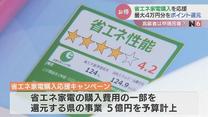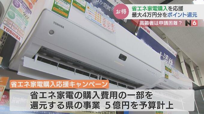 省エネ性能の高い家電を購入した人に最大4万円分のポイントを還元する県のキャンペーンが今月23日からスタートします。対象はエアコン、冷蔵庫、LED照明の3つで、お買い得な一方、高齢者にはポイントの申請が難しくなっています。