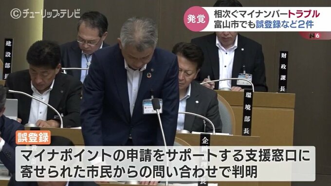これは20日の富山市議会一般質問で共産党の吉田修市議の質問に対して市が明らかにしたものです。誤った登録はマイナポイントの申請手続きをサポートする支援窓口に寄せられた市民からの問い合わせで判明。