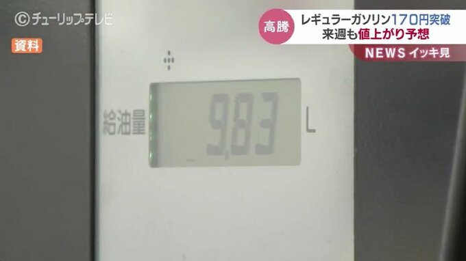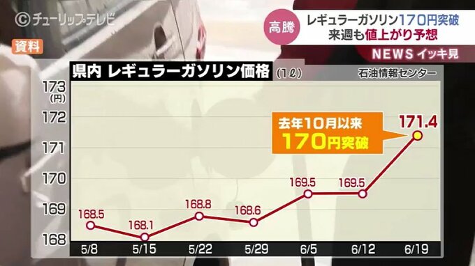 富山県内のレギュラーガソリンの平均小売価格は先月末から値上がりに転じおととい時点で1リットルあたり171.4円となり去年10月ぶりに170円を超えました。