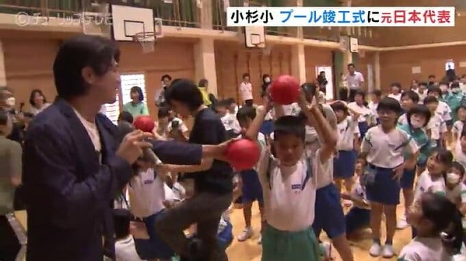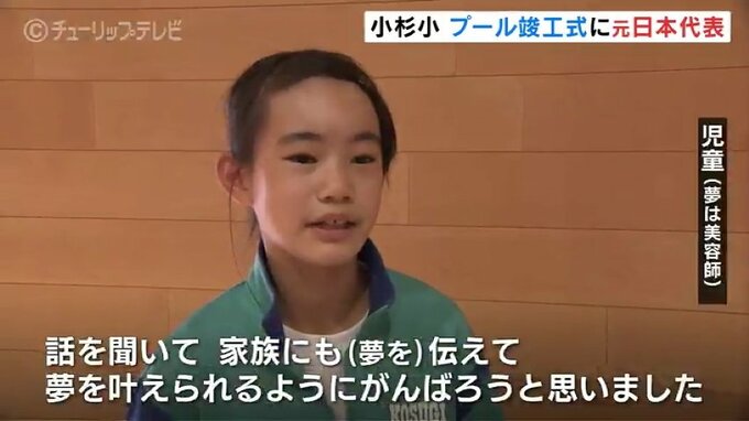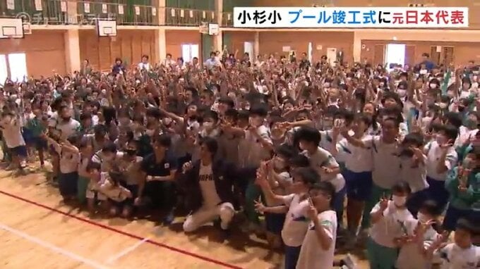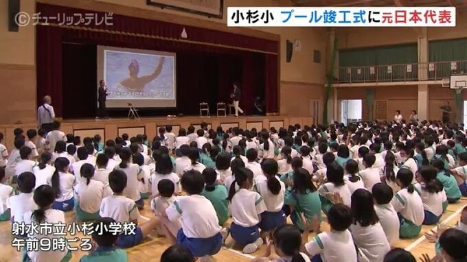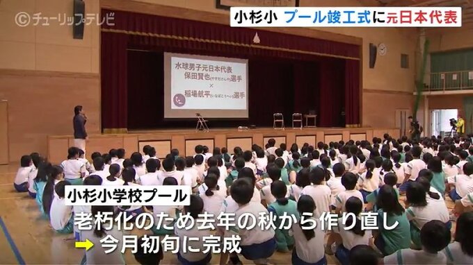 富山・射水市の小杉小学校では22日に新プール完成を祝う、竣工式がおこなわれ水球のオリンピック元日本代表が招かれました。