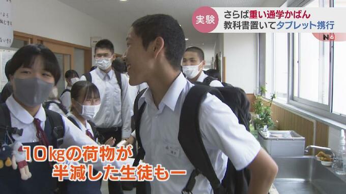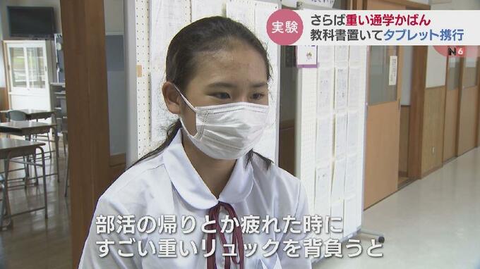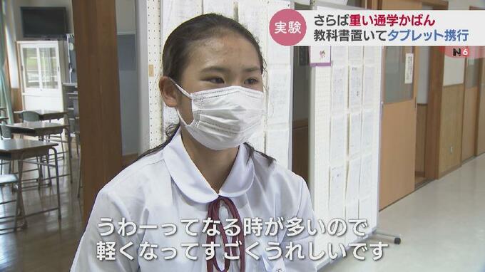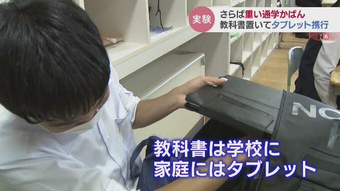 生徒:「こんな感じです。家で勉強するものをタブレットは持ち帰るって感じになってます。教科書とワークと、ノートで入らないくらいの日はありました。部活の帰りとか疲れた時にすごい重いリュックとか背負うと『うわー』ってなる時が多いので、軽くなって、すごいうれしいです」