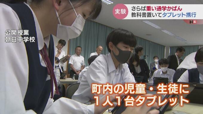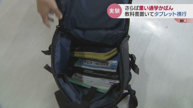 朝日町の教育委員会が行った事前のアンケートでは、子どもたちの持ち物の重さは小学生が平均5キロ。部活動の用具が加わる中学生は平均で10キロで、このうち教科書やノートは3.5キロ程度を占めています。そこで、朝日町では19日から5日間、中学生と小学6年生を対象に教科書は学校や家庭に置いてタブレット端末を持ち帰る「らくらく登校ウィーク」を試験的に実施しています。