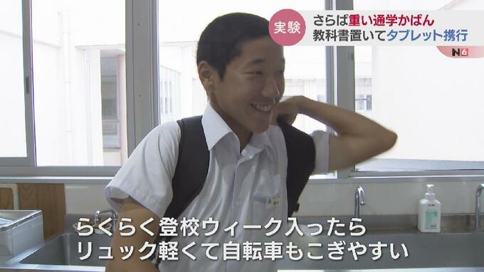 生徒:「教科書持ってこなくていいっていうのがやっぱ楽っすね。満杯、これがここらへんまで教科書あった。チャリ通(自転車通学)なんで3キロぐらい通ってるんですけど、らくらくウィーク入ったらリュック軽くてチャリも漕ぎやすいっす」