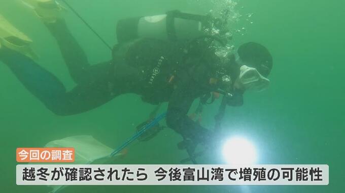 今回の調査で越冬したことが確認されれば、今後、富山湾全域で増殖する可能性もあると見ています。今回の潜水調査では、海の濁りがひどくて視界が悪かったのですが、岩場に隠れていた1匹を見つけました。