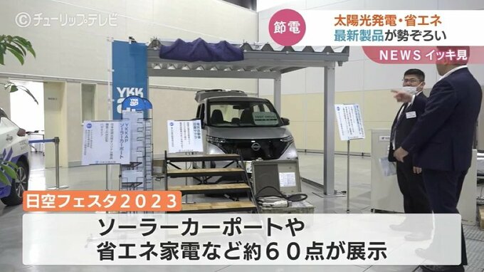 展示会は空調設備などを扱う「日本空調北陸」が主催したもので、会場には北陸で初めて開発されたソーラーカーポートや省エネ家電などおよそ60点が展示されています。